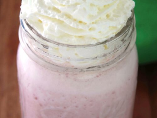 Place ice cream, milk, syrups, and ice into a blender. Top with whipped cream and enjoy. Blend ice cream, milk, ice, raspberry jam, and sprinkles.
